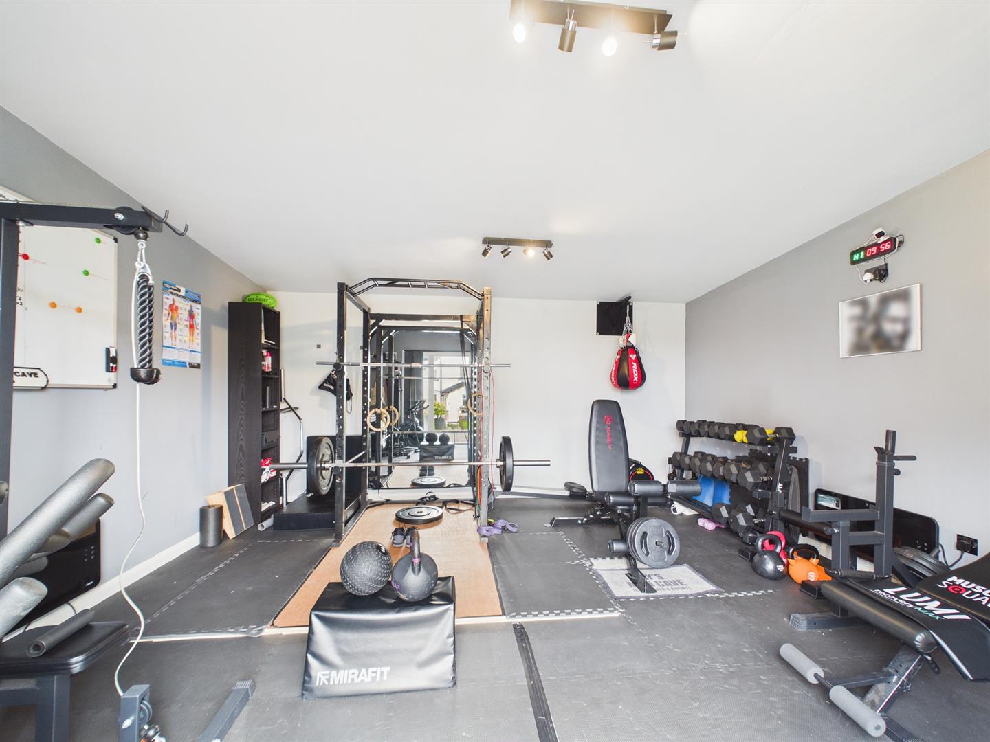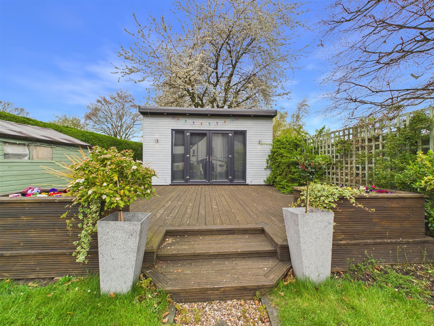 Externally, the property occupies a larger-than-average plot with open views to the rear. The garden also includes a bespoke outbuilding, currently used as a home gym, complete with lighting and heating, making it suitable for a variety of uses.