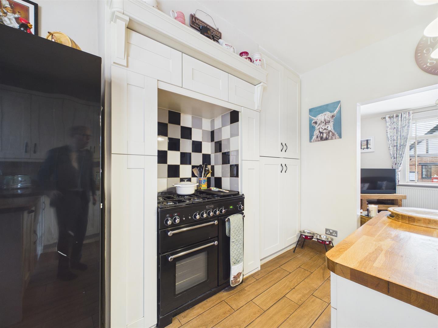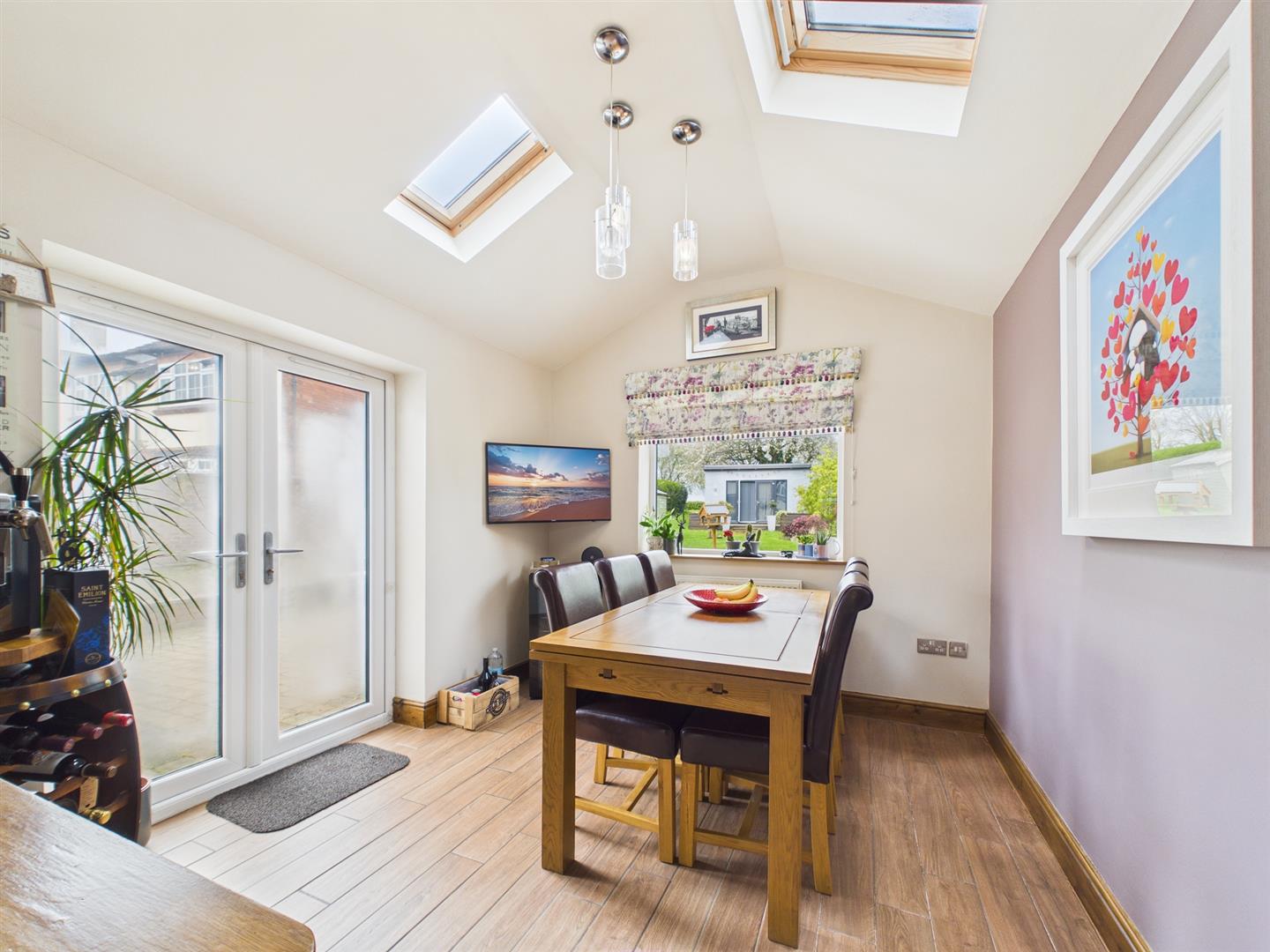 The kitchen is fitted with a range of built-in appliances, including a Rangemaster cooker, and offers space for an American-style fridge freezer. The dining area enjoys views over the rear garden, with double patio doors opening directly onto the outdoor seating area ideal for entertaining.