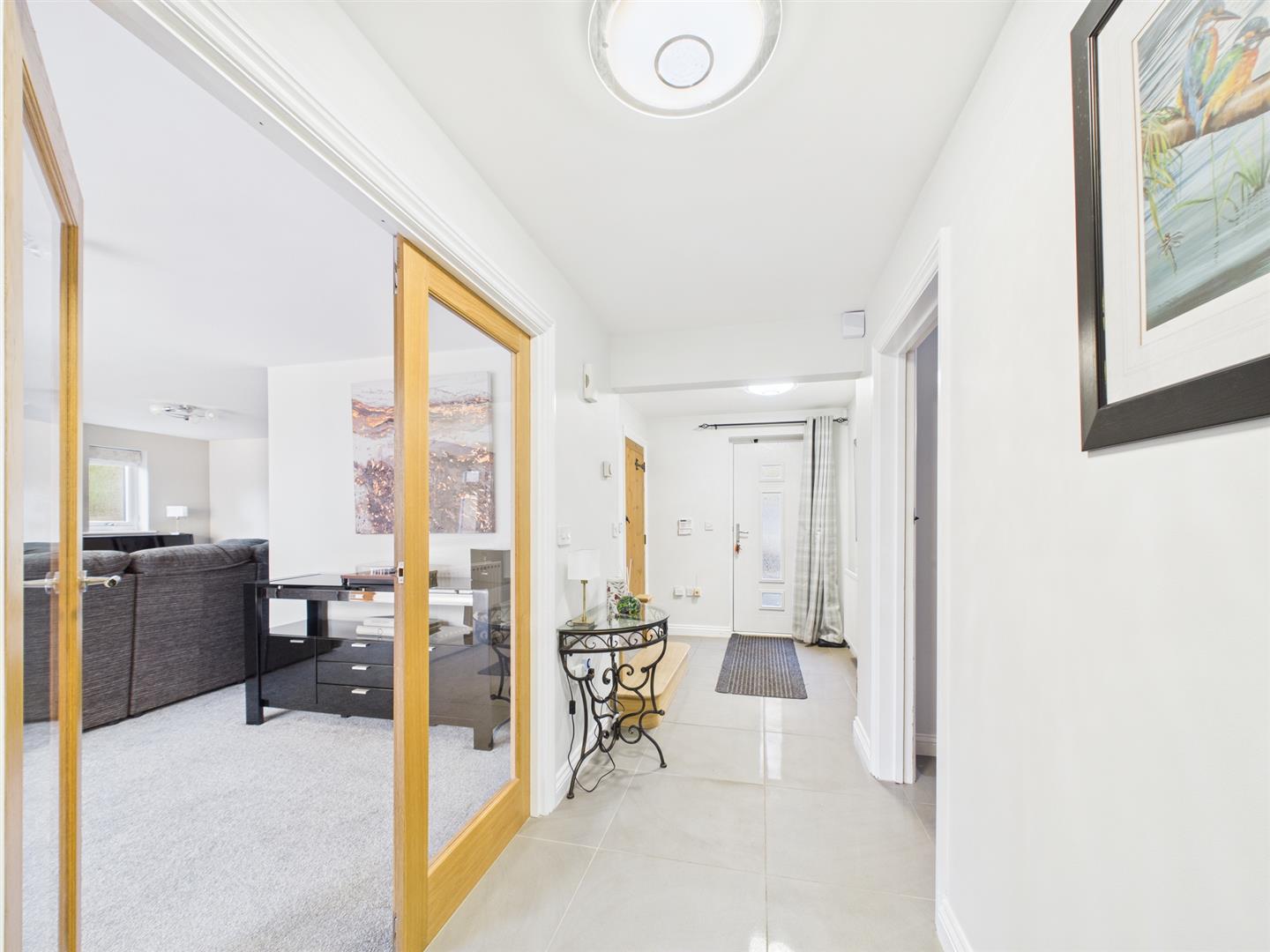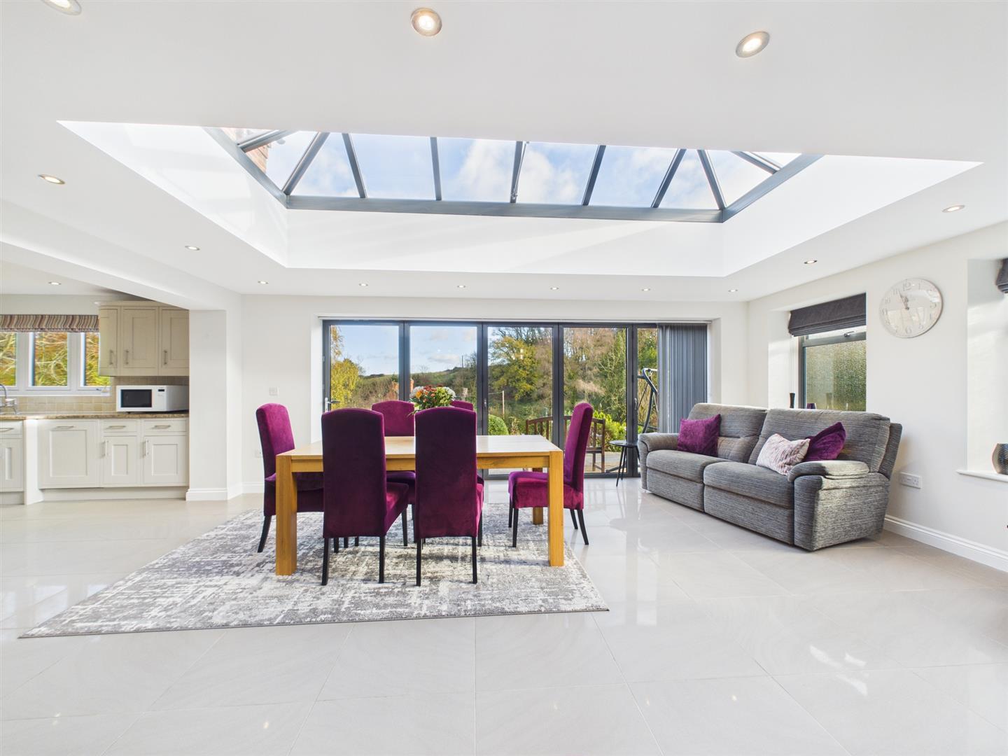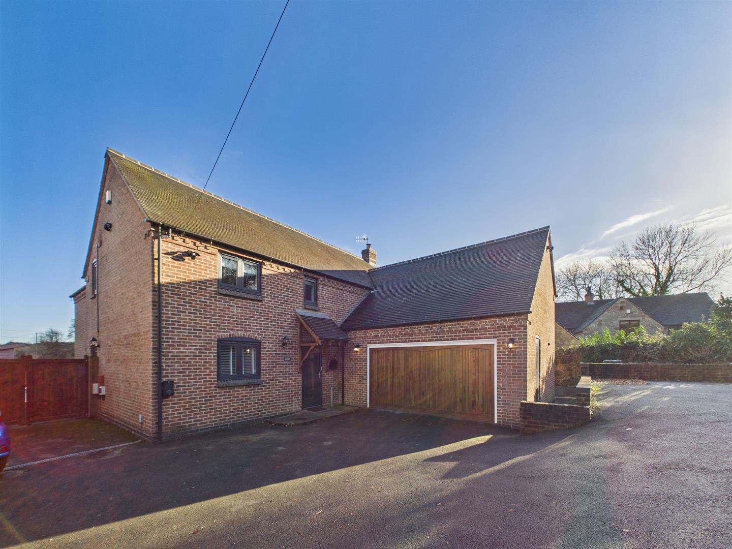 A truly exceptional detached residence, positioned within a highly desirable location and perfectly placed for superb transport connections. This exquisite home offers generous private parking, a substantial double garage, and elegant, contemporary open-plan living, all enhanced by breathtaking, far-reaching views and a beautifully secluded rear garden.Upon entering, you are welcomed by a spacious entrance hall that sets the tone for the rest of the property. The lounge is a refined and inviting space, featuring a stylish log burner and striking quadruple glass bi-fold doors that seamlessly open onto the spectacular kitchen and dining area. The bespoke kitchen boasts a premium breakfast bar, while the dining area enjoys luxurious underfloor heating, an ideal setting for both everyday living and sophisticated entertaining. Additional ground-floor accommodation includes a separate dining room, a well-appointed utility room, and a contemporary WC/cloakroom.