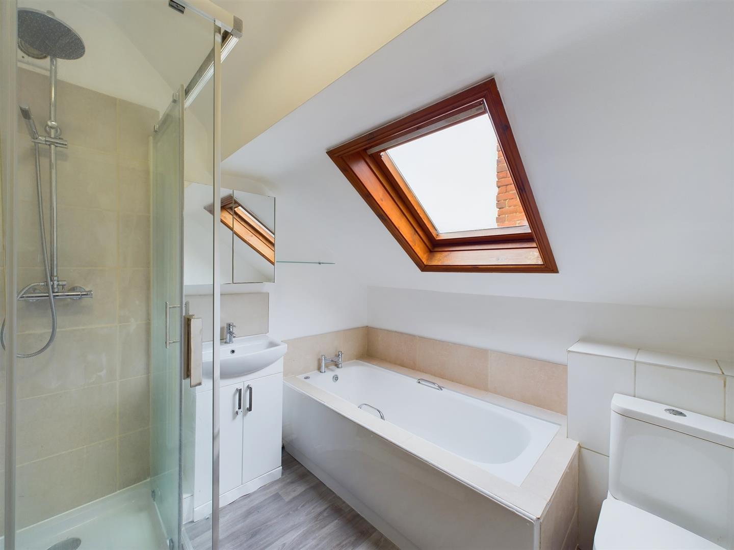 Upstairs, there are two double bedrooms—both benefiting from built-in storage—and a well-sized bathroom complete with a separate bath and shower.